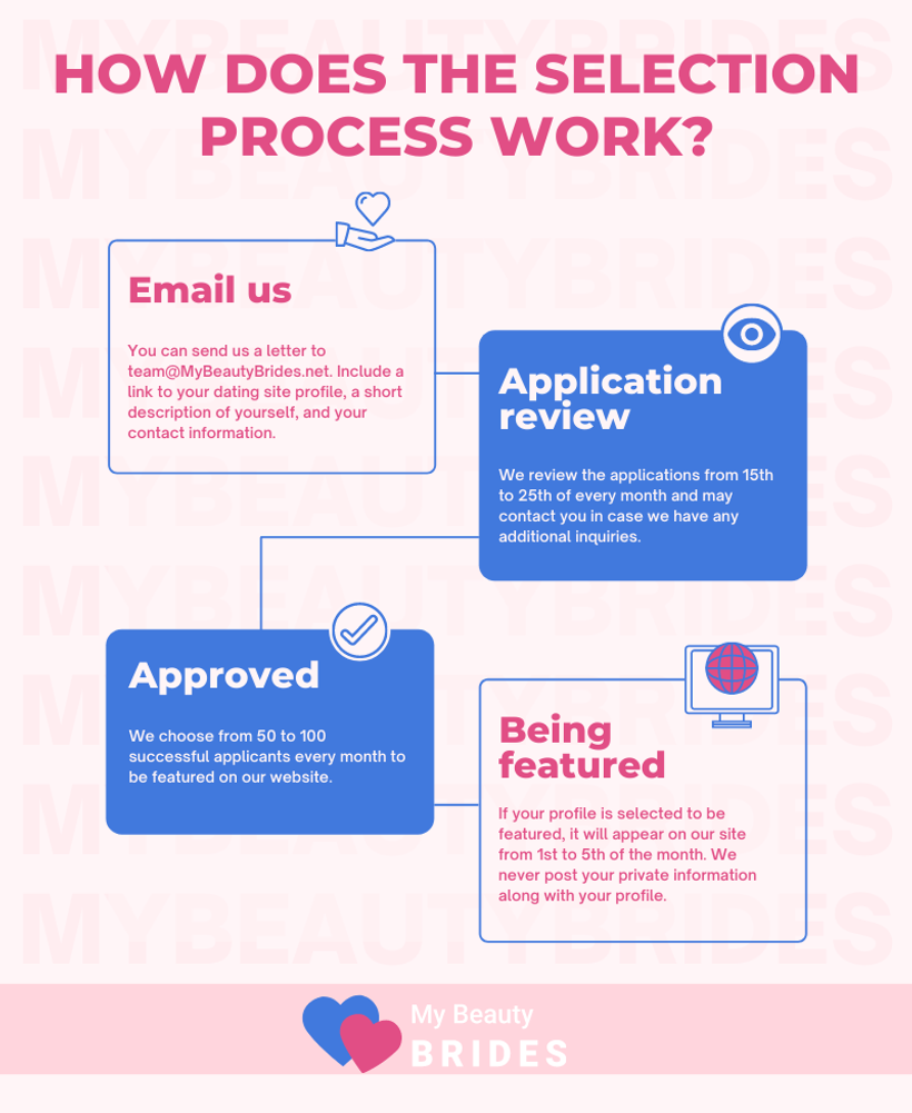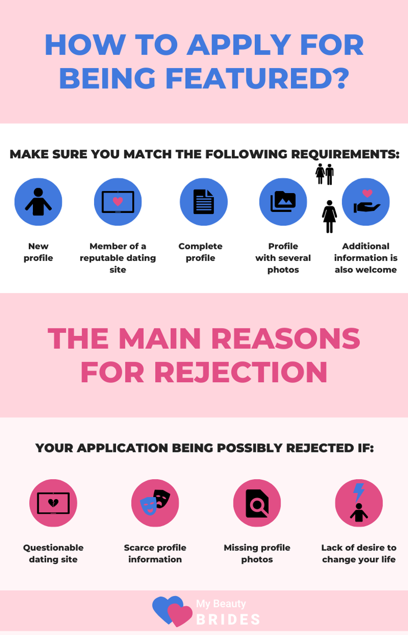 Our goal is to provide our male readers with the most attractive single female candidates for serious relationships and marriage. That is why we cannot accept every lady who applies to be featured on our site. These are the most common reasons for your application being possibly rejected:
