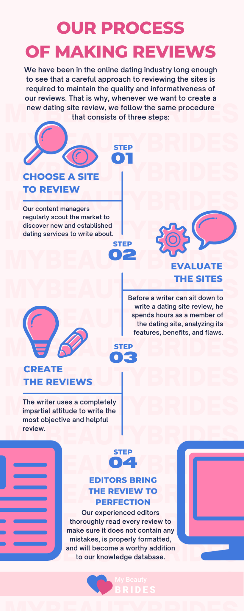MyBeautyBrides.net is an online resource that finds, reviews, and analyzes the leading and up-and-coming international dating sites in order to bring our readers the most effective, secure, and popular sites in the industry. We use a variety of tools and metrics, as well as our own expertise, to become your trusted guides in the precarious world of online dating.